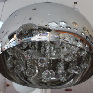 Pendente cromado com cristais translúcidos.